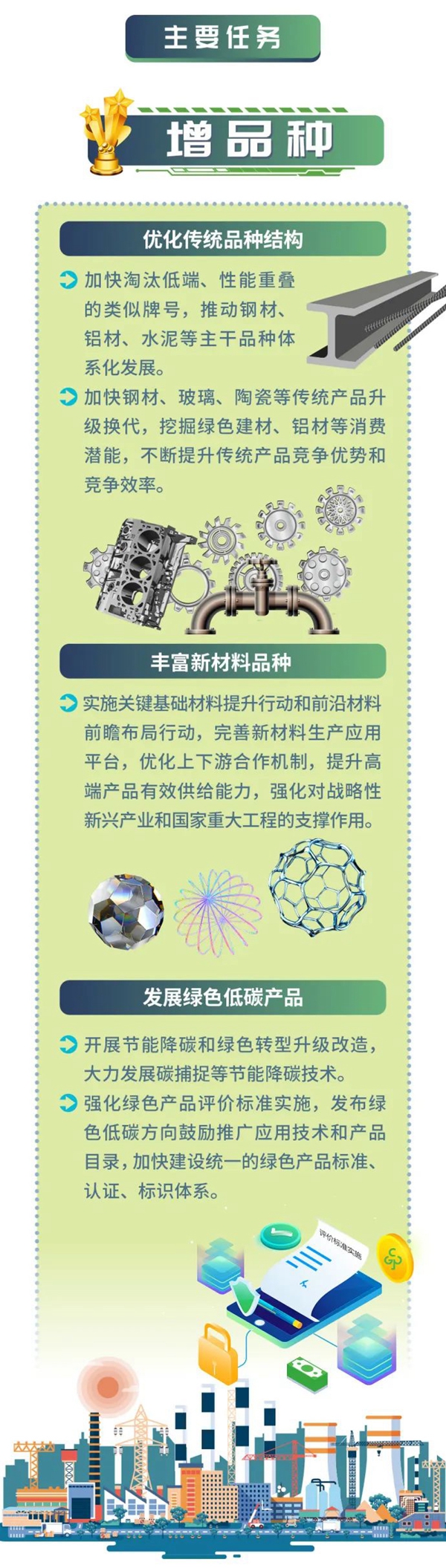 增品種——圍繞建材等行業(yè),開展節(jié)能降碳和綠色轉(zhuǎn)型升級(jí)改造,逐步降低原材料產(chǎn)品單位能耗和碳排放量。