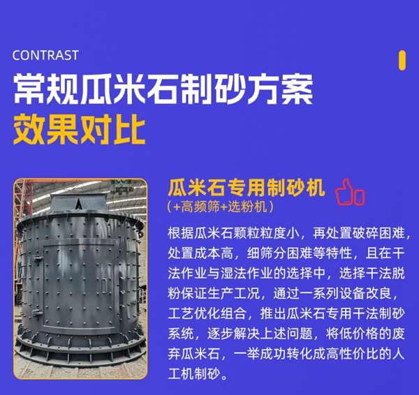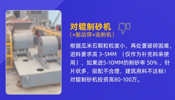 根據(jù)瓜米石顆粒粒度小,再處置破碎困難,進(jìn)料要求高3-5MM(僅作為補(bǔ)充料來使用),如果進(jìn)5-10MM的制砂率50%,針片狀多,級(jí)配不合理,建筑用料不達(dá)標(biāo),對(duì)輥制砂機(jī)投資高80-100萬。