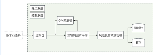 主用裝備:瓜米石低制粉全篩分制砂機(jī)、三軸圓水平篩、風(fēng)選復(fù)合式脫粉機(jī)、除塵系統(tǒng)、控制系統(tǒng)