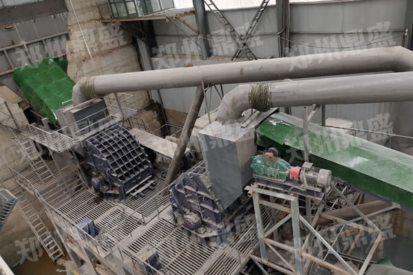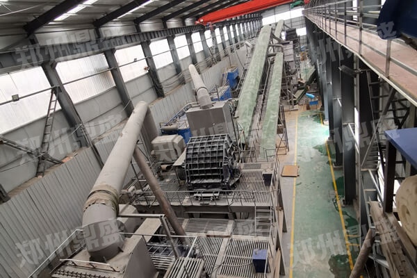 料倉內(nèi)的物料進(jìn)入振動(dòng)篩分喂料機(jī)后,喂料機(jī)前端篦條將物料分成兩種物料<70mm和>70mm,其中<70mm經(jīng)皮帶輸送機(jī)送至除土篩,經(jīng)除土篩篩分出>10mm和<10mm兩種物料,其中<10mm的作為渣土經(jīng)由輸送機(jī)輸送至廢渣區(qū)存儲(chǔ),>10mm被送至ZPC1820錘式破碎機(jī)后篩分上料皮帶;>70mm的物料經(jīng)過溜槽直接進(jìn)入ZPC1820錘式破碎機(jī)進(jìn)行粗碎。