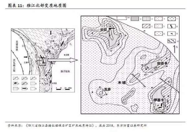 四川鋰輝石礦分布集中,平均品位約1.30%-1.42%,主要分布在馬爾康、金川、康定、雅江、道孚等縣?;◢弬ゾr型鋰礦主要分布在新疆阿爾泰成礦帶、川西松潘–甘孜成礦帶,典型礦床為新疆北部阿爾泰的可可托海鋰多金屬礦床、新疆西南部的大紅柳灘鋰多金屬礦床及川西甲基卡鋰鈹鈮鉭銣礦床等。川西一帶偉晶巖型鋰礦主要發(fā)育于松潘-甘孜造山帶東緣,其包含甲基卡、馬爾康、黨壩、扎烏龍等礦床,形成了四川典型的金川-馬爾康成礦區(qū)和康定-道孚成礦區(qū),代表鋰礦有“甲基卡礦田”和“可爾因礦田”,該區(qū)鋰礦都產(chǎn)于花崗偉晶巖脈中,成礦母巖為二云母花崗巖。花崗偉晶巖脈為鋰礦的賦存和載體,脈體受構造、地層等的控制,鋰礦脈3~450 m不等,平均30~50 m,厚度3~21m不等,平均約3~5m,資源儲量豐富。