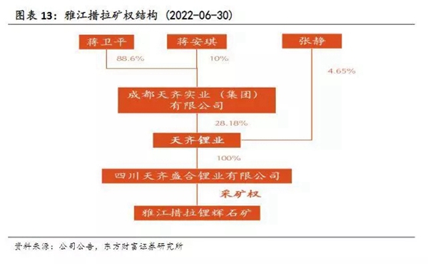 礦權歸屬:雅江措拉鋰礦采礦權屬于天齊鋰業(yè),實控人為蔣衛(wèi)平。雅江措拉鋰礦采礦權為天齊盛合(天齊鋰業(yè)子公司)所有,實控人蔣衛(wèi)平及其一致行動人通過天齊集團持有上市公司天齊鋰業(yè)28.18%股權,另外蔣衛(wèi)平之妻張靜亦直接持有天齊鋰業(yè)4.65%股權,兩者持有權益合計約33%。