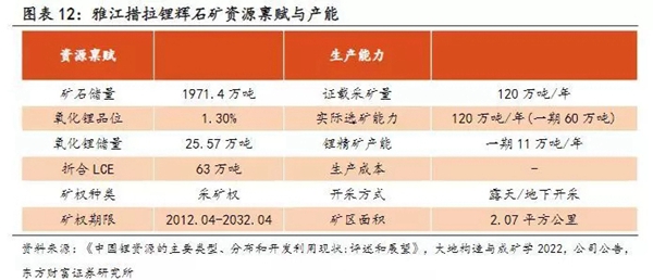 資源稟賦&產(chǎn)能:(1)稟賦。四川省雅江縣措拉鋰輝石礦區(qū)的礦石儲量為1971.4萬噸,Li2O儲量25.57萬噸(折合LCE63萬噸),平均Li2O品位為1.30%,伴生鈹、鈮、鉭。(2)產(chǎn)能。該礦區(qū)采用露天及地下兩種開采方式,證載采礦量為120萬噸每年,其中一期鋰精礦產(chǎn)能為11萬噸每年。是天齊鋰業(yè)在國內(nèi)布局的主要鋰精礦,擬采用“浮選+磁選”采選工藝,目前為緩建狀態(tài)。據(jù)天齊鋰業(yè)22H1半年報,截至本期末,受多種因素影響,雅江縣措拉鋰輝石礦采選礦一期工程項目尚無重大進展,公司正在就該項目重啟進行相應的可行性研究,計劃在不久的將來盡快重啟國內(nèi)雅江措拉鋰礦的開采和生產(chǎn)。