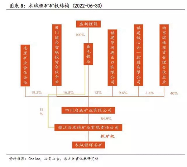 礦權歸屬:木絨鋰礦探礦權歸屬于雅江惠絨,尚未開采投產(chǎn)。據(jù)盛新鋰能21年報披露,木絨鋰礦尚處于勘探階段,并無采礦權,該礦山項目的儲量報告正在編制中,后續(xù)惠絨礦業(yè)將適時推進探轉采的相關工作。雅江惠絨為四川啟成礦業(yè)有限公司的控股,啟成礦業(yè)持股84.9%,而啟成礦業(yè)股權由多方組成,較為分散。