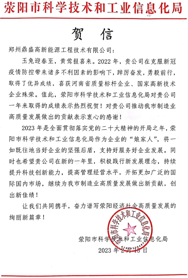 2月15日,滎陽(yáng)市科學(xué)技術(shù)和工業(yè)信息化局向鄭州鼎盛高新能源工程技術(shù)有限公司(以下簡(jiǎn)稱(chēng)“鄭州鼎盛”)發(fā)來(lái)賀信。向公司過(guò)去一年取得優(yōu)異成績(jī)表示祝賀,恭賀鄭州鼎盛喜獲河南省質(zhì)量標(biāo)桿企業(yè)、國(guó)家高新技術(shù)企業(yè)等殊榮。對(duì)鄭州鼎盛推動(dòng)滎陽(yáng)市制造業(yè)高質(zhì)量發(fā)展做出的貢獻(xiàn)表示感謝。
