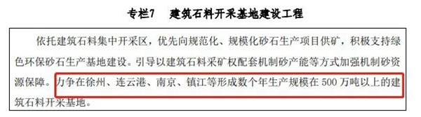 《規(guī)劃》強(qiáng)調(diào)長(zhǎng)江經(jīng)濟(jì)帶、長(zhǎng)三角區(qū)域一體化發(fā)展等國(guó)家發(fā)展戰(zhàn)略實(shí)施,新型工業(yè)化、新型城鎮(zhèn)化的推動(dòng)以及大量基礎(chǔ)設(shè)施建設(shè),對(duì)礦產(chǎn)資源的需求仍將維持在高 位。砂石資源供需矛盾突出,要統(tǒng)籌實(shí)施國(guó)家戰(zhàn)略性礦產(chǎn)和江蘇重要礦產(chǎn)的勘查開(kāi)發(fā),保持一定規(guī)模的礦產(chǎn)開(kāi)采總量,提高礦產(chǎn)資源保障能力,規(guī)?;_(kāi)采建筑石料,滿足經(jīng)濟(jì)社會(huì)發(fā)展需求。