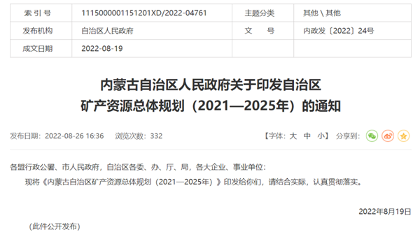 近日,內(nèi)蒙古自治區(qū)人民政府印發(fā)《內(nèi)蒙古自治區(qū)礦產(chǎn)資源總體規(guī)劃(2021—2025年)》,提出到2025年,重要礦產(chǎn)的供應保障體系更趨完善,勘查開發(fā)區(qū)域布局更趨合理,礦產(chǎn)資源勘查開發(fā)與環(huán)境保護更加協(xié)調(diào),基本形成綠色勘查開發(fā)新格局。