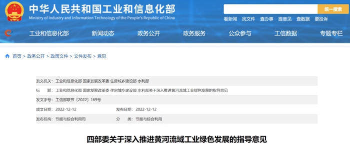 12月12日,工業(yè)和信息化部、國家發(fā)展改革委、住房城鄉(xiāng)建設(shè)部、水利部四部門聯(lián)合發(fā)布《關(guān)于深入推進(jìn)黃河流域工業(yè)綠色發(fā)展的指導(dǎo)意見》,以下簡稱《意見》。