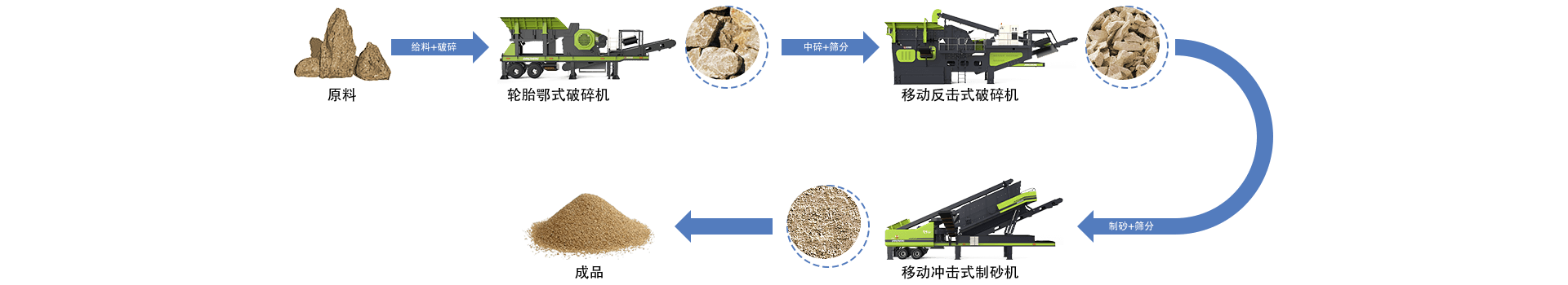 設(shè)備配置:WJC輪胎鄂破 WAF反擊破 WRV制砂機(jī)