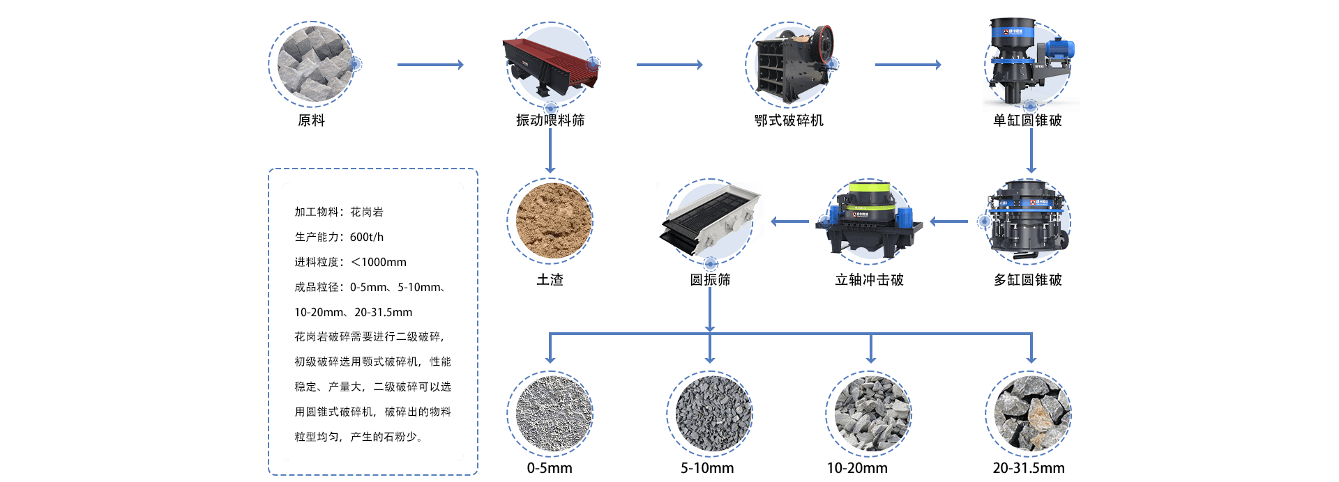花崗巖破碎需要進行二級破碎,初級破碎選用顎式破碎機,性能穩(wěn)定,產(chǎn)量大,二級破碎可以選用圓錐式破碎機,破碎出的物料粒型均勻,產(chǎn)生的石粉少。